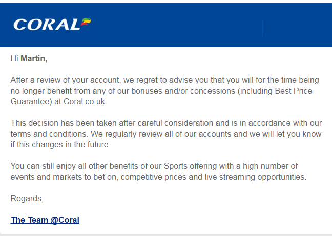 I tried applying for affiliate accounts with 5 of the main bookmakers, however, as part of the application process they check out your website and see that I am promoting Matched Betting, which they’re probably not to keen on, so 3 of them refused my application. One of those was Coral, so my suspicions are that they put two and two together and linked my personal account with the application for the affiliate account. Oh well, lesson learned!!!